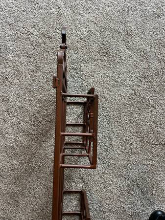 This large brown metal rack can hold magazines, accessories, and more. Approximately 4‘4“ tall. Three basket areas that are approximately 3 1/2 inches deep by 7 inches tall.L and 1 foot wide. Porch...